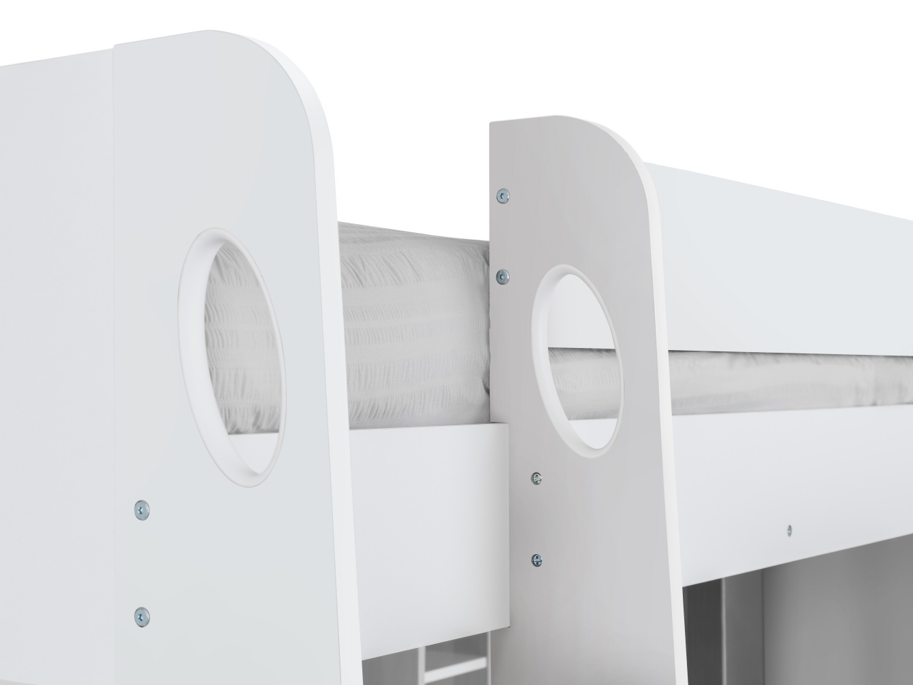 The Aurora High Sleeper provides ample storage within a compact space, the perfect set up for kids and teenagers. Finished in a white wrap, this high sleeper combines drawers, shelves, a hanging rail and pull-out desk with cable holes. The Aurora also includes a tall mirror upon a panel underneath the bed, suitable for use when getting ready.