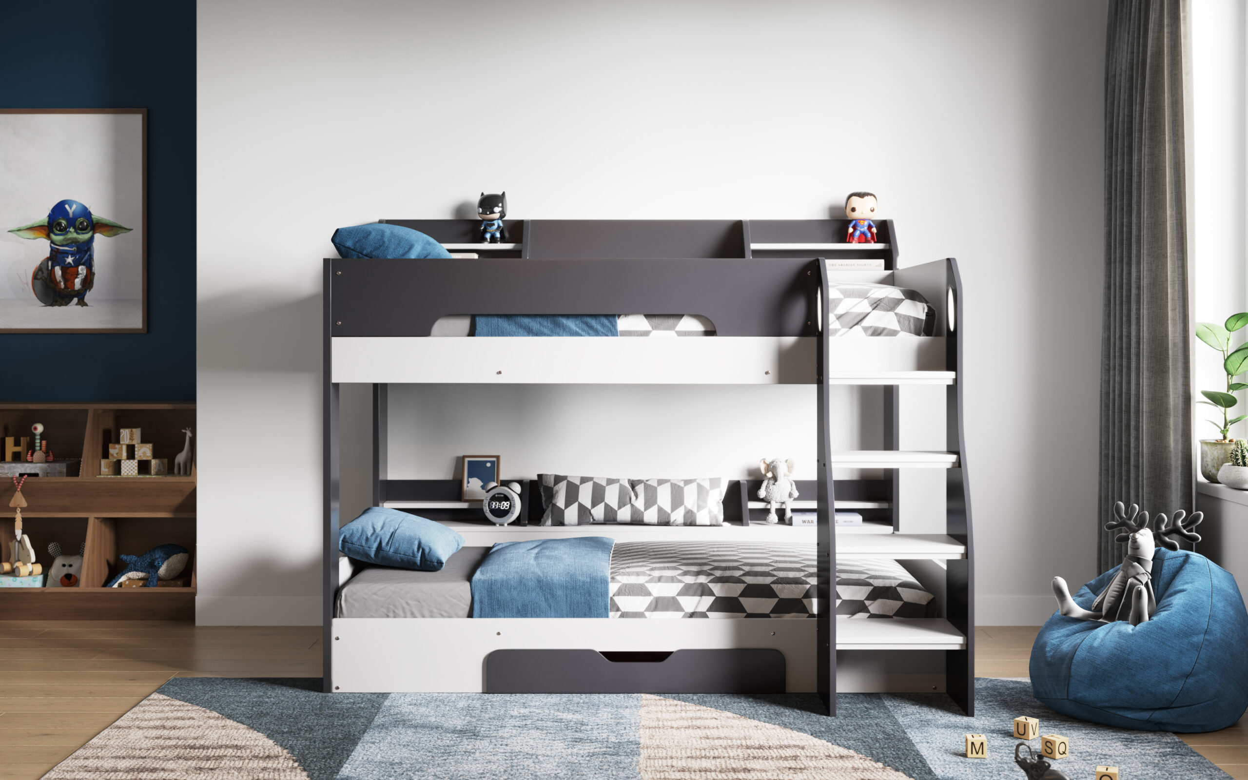 Both the top and bottom bunks have spacious shelving for storing toys, games, books, or anything else you want. The bed also comes with a spacious under-bed drawer on wheels, so you can keep your bedroom clutter-free.