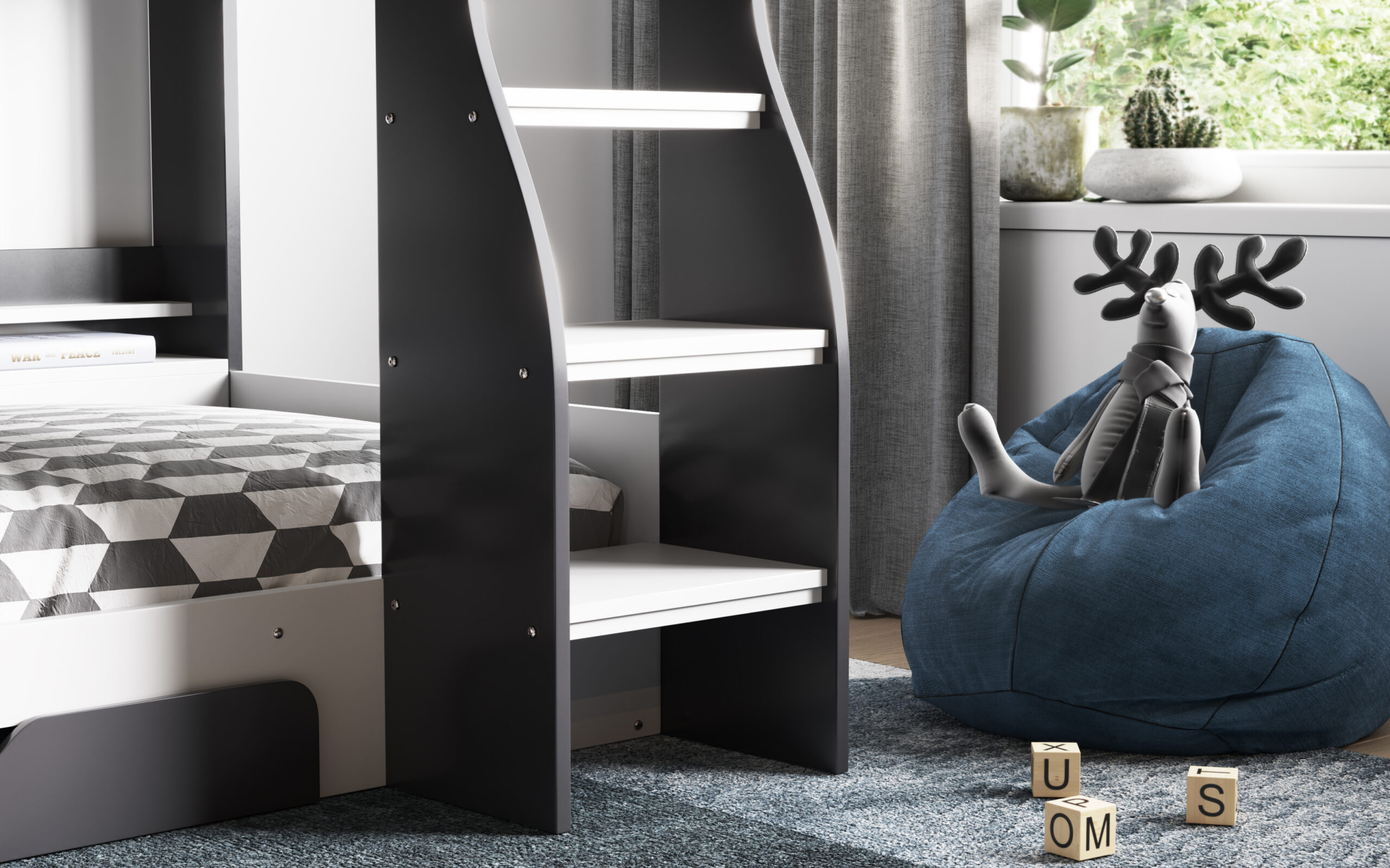 This bunk bed is designed to be safe and secure, with raised side-panelling, a headboard, and a footboard. The wide steps on the ladder provide extra stability and balance.