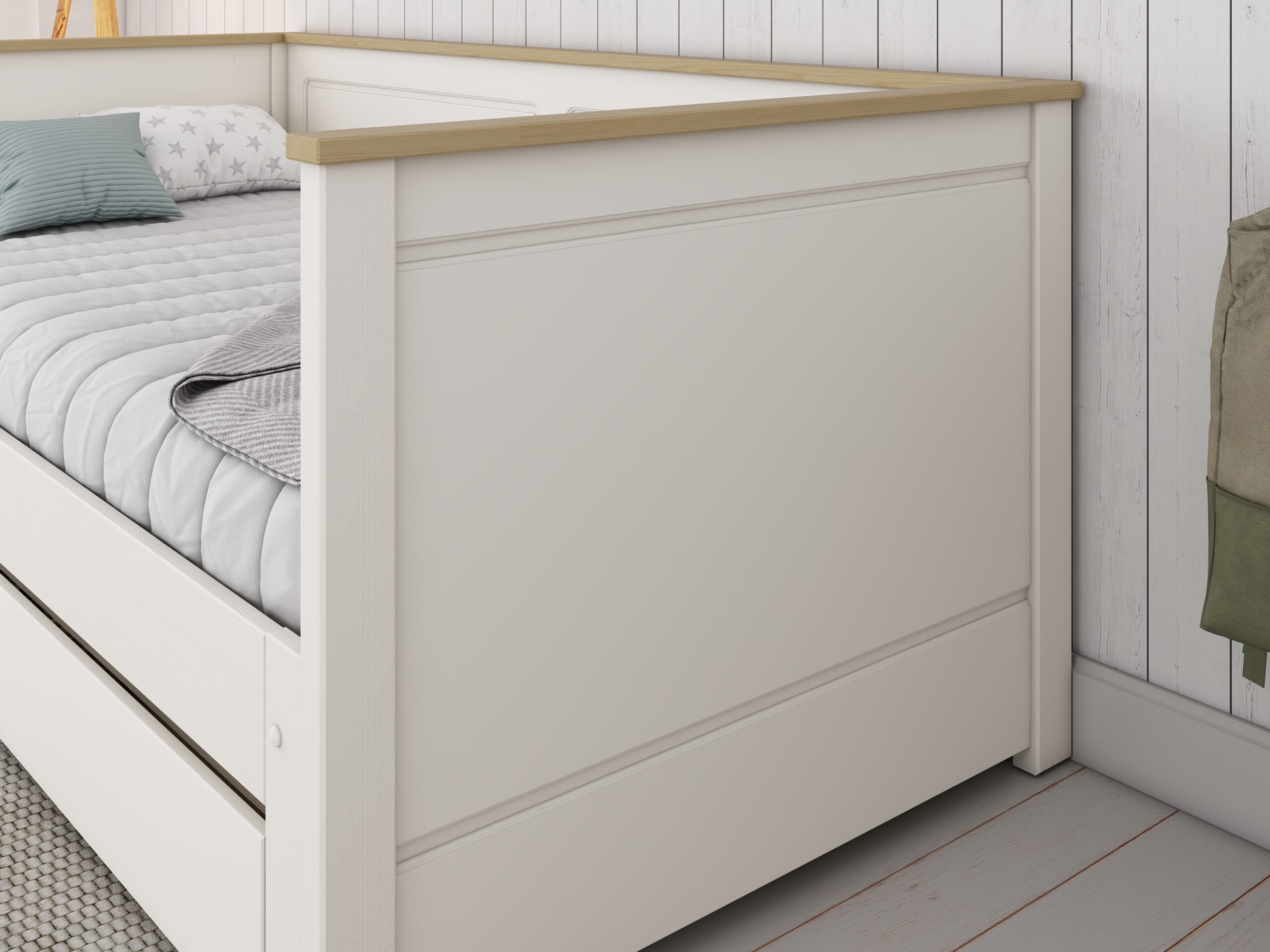 The Heritage Daybed with Trundle from Kids Avenue is a classy day bed in a white and oak finish.