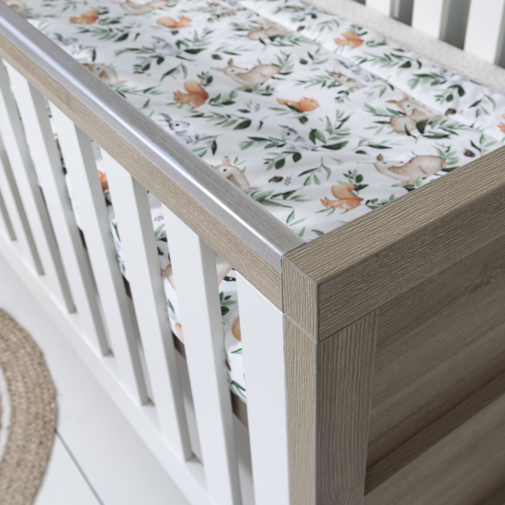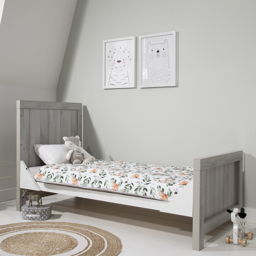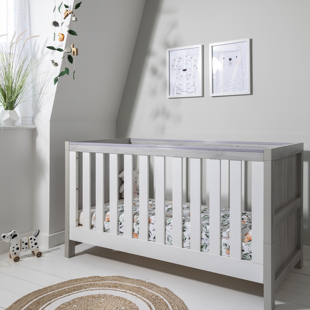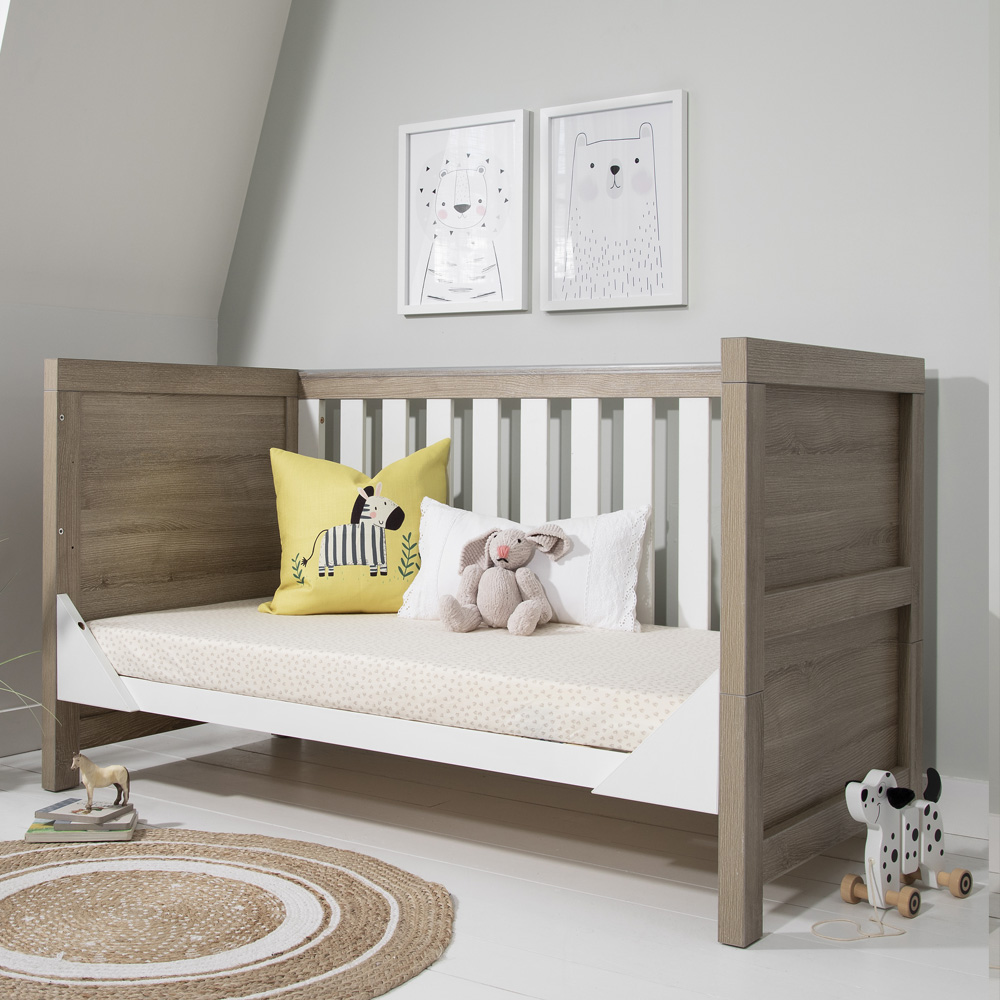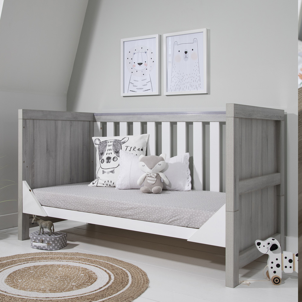 The Modena Cot bed has a beautiful contemporary design combining a classic grey ash finish with modern white detailing. The Modena converts into a toddler bed and sofa bed making it the perfect choice for any nursery designed to grow with your little one.
