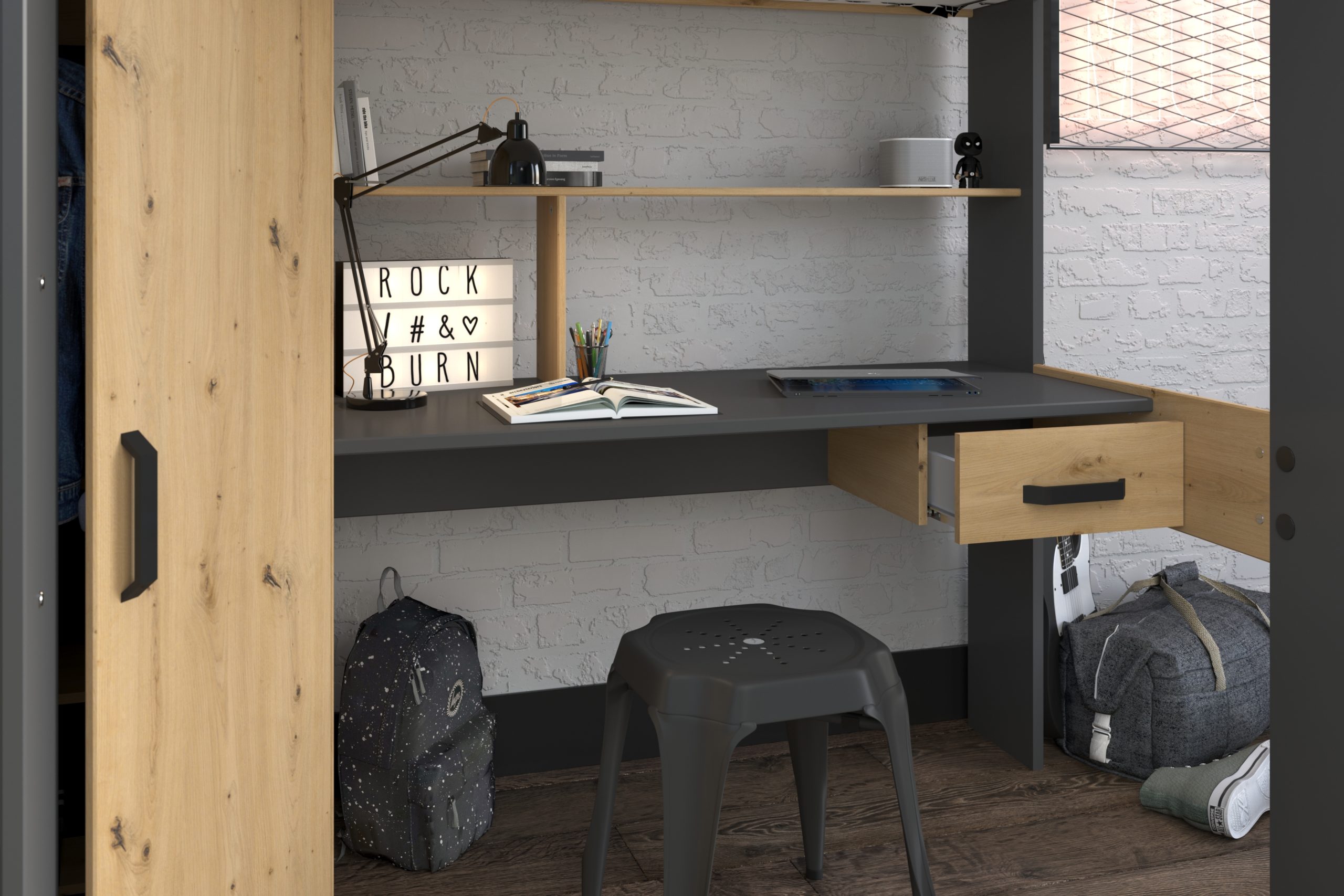 The Parisot Grayson Highsleeper bed finished in wood effect laminate and grey trim, featuring built under desk, corner wardrobe and useful shelving.