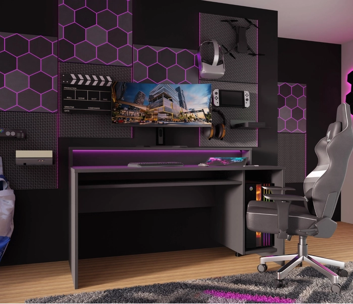 A handy shelf provides accessible storage for gaming peripherals, and the spacious desktop offers plenty of room for your keyboard and mouse.