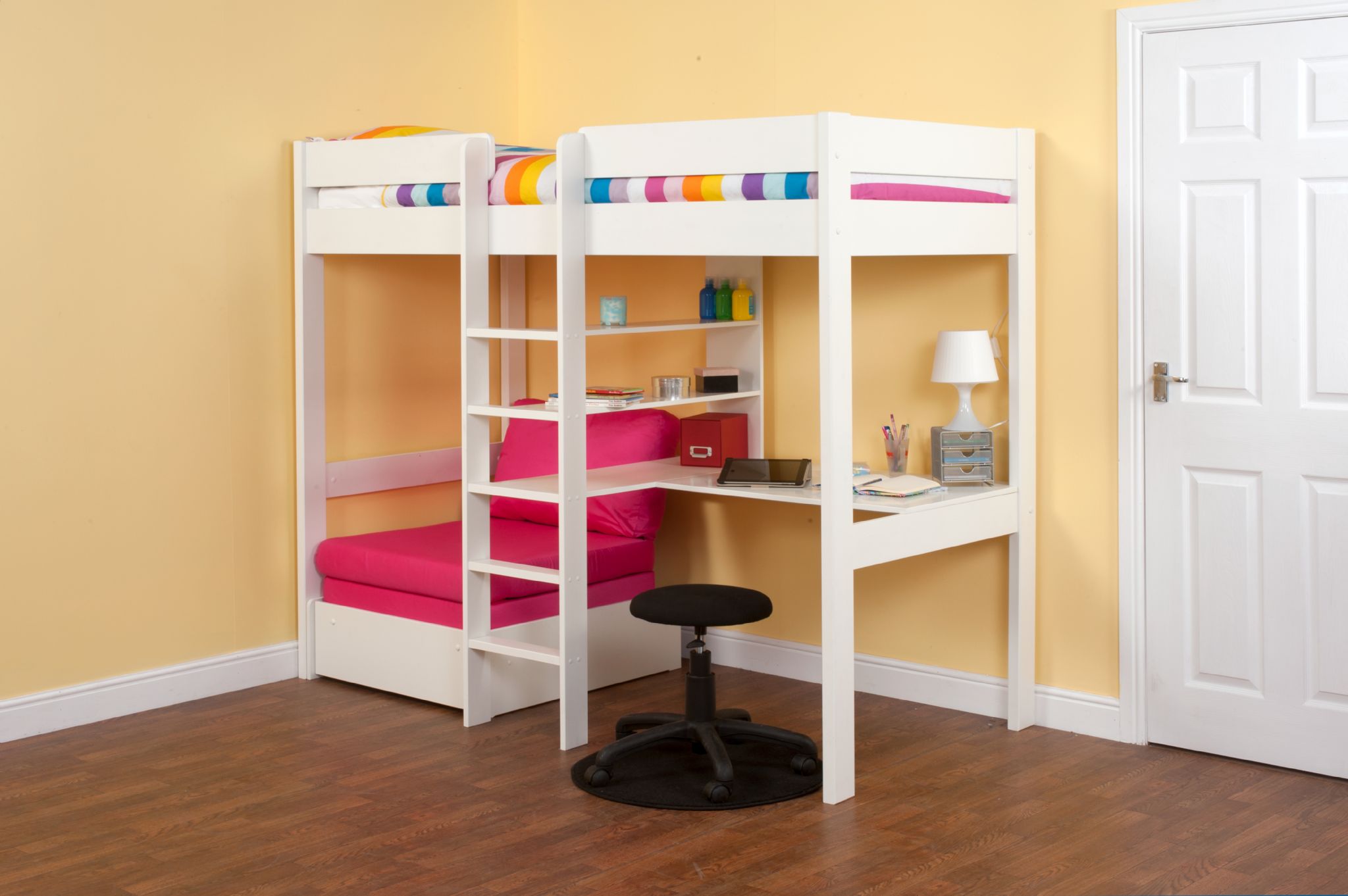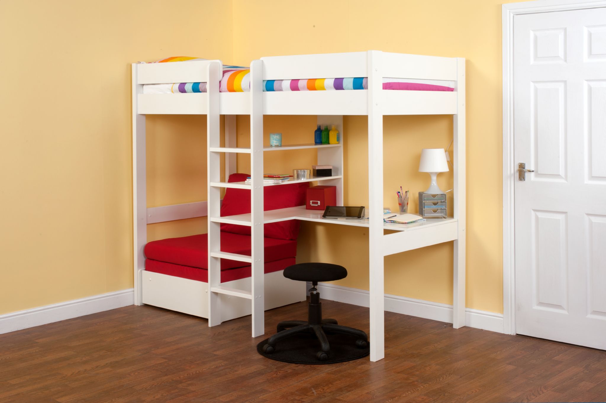 This package has an L-shaped desk and central shelving and a chair bed with an range of colour options for the cushion set, the desk and the chair can be positioned on building to either side of the ladder section.