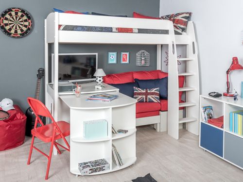 This package includes a corner sofa with hidden storage compartment below, a fixed desk and extendable pullout desk and there is also a free standing cubed unit which Stompa shows pictured beneath the desk.